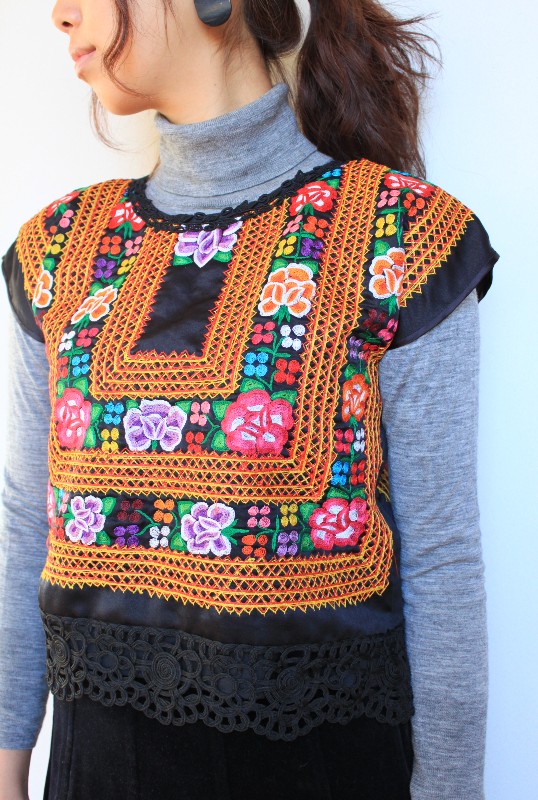 テワナの刺繍ウィピルをワンピースの上に重ね着もでき、スカート丈に合うボレロ風に仕立て直しました。