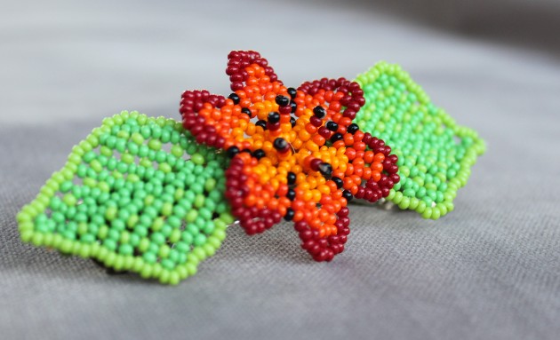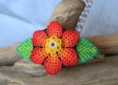 メキシコの先住民族、ウィチョルの人々がビーズで一つ一つ手作りしたバレッタです。 ウィチョル族はメキシコ北部の山の中に暮らす人々で、ビーズで細かい絵を描いたり、系をはり付けたネアリカという毛糸絵を生み出します。彼らにとってそれらの芸術品はアートというよりは精神世界を表したものです。 ウィチョルの女性たちは日常の装いにビーズで作ったピアスやネックレス、ブレスレットをはめ、カラフルな生地のスカートや手織りの模様入りバッグ、皮サンダルと合わせます。 インパクトがありますが、つけるとお洒落なアクセサリーです。 A・B・C 3,000円 横幅 約 8.5cm 花部分直径 4cm D 4,300円 横幅 9.5cm 花部分直径 5.5cm すべて手作りの1点物です。 メキシコ製