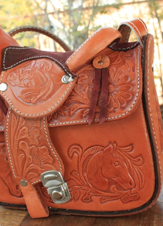 なんと小さなミニチュア馬の鞍が蓋になった可愛いバッグです。