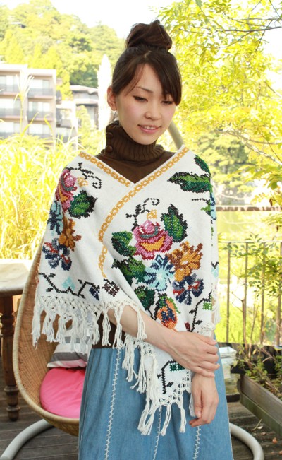 プエブラ州の刺繍ポンチョ [薔薇の花ホワイト]