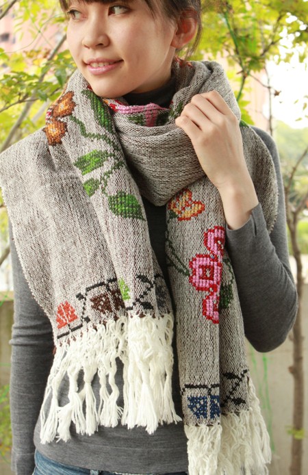 丁寧に手つむぎした糸を、一枚一枚手織りし、チクチクと手刺繍で仕上げた、