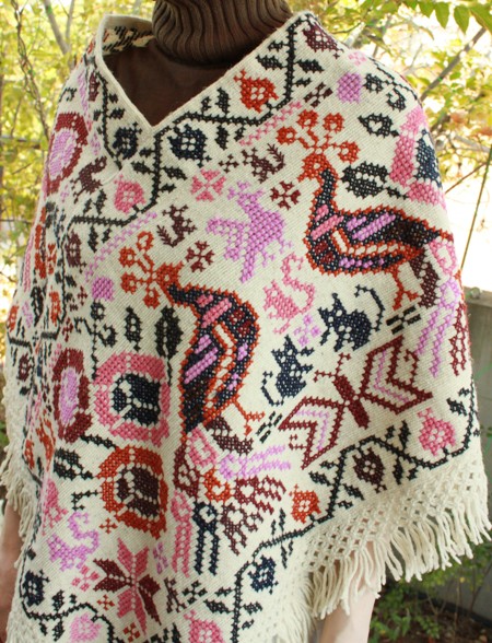 そこに手刺繍を入れて、ポンチョの形に縫製してあります。