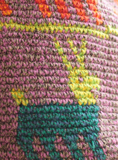 多色のコットン糸を混ぜて編んでいくことにより平面的にならず、味のあるカラフルな仕上がりに。