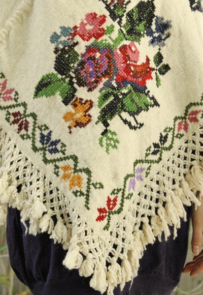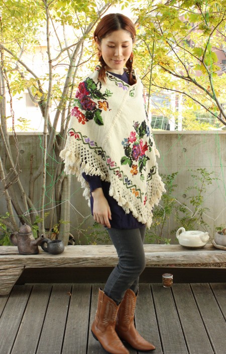 そこに手刺繍を入れて、ポンチョの形に縫製してあります。