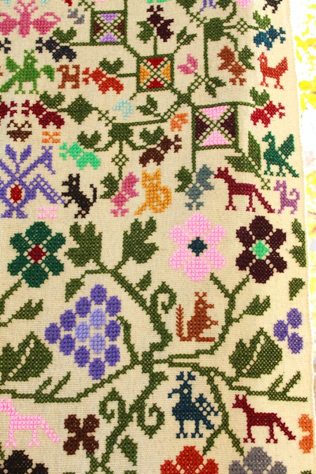 クロスステッチで手刺繍を入れて、フリンジを編み、仕上げます。