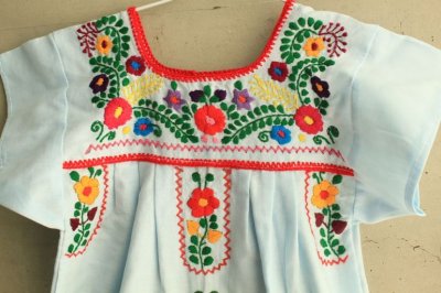 メキシコ刺繍のワンピースライトブルー [身幅28cm〜32cm丈54cm(最短45cmまでカット可能)]