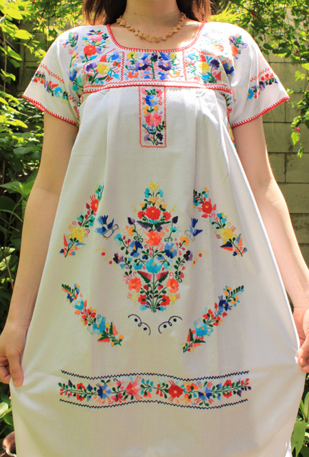 メキシコ、プエブラ州の花の刺繍ワンピース。