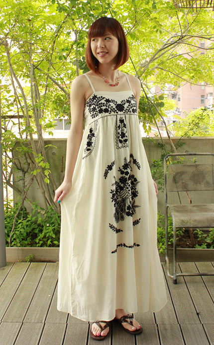メキシカン花とクジャクの刺繍キャミソールロングワンピース