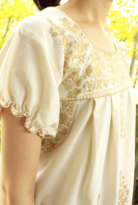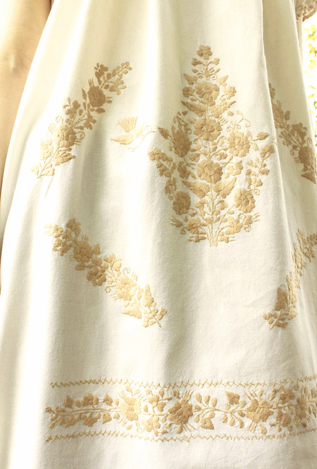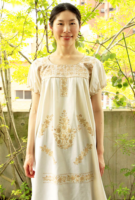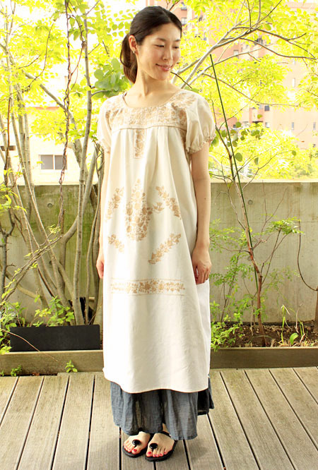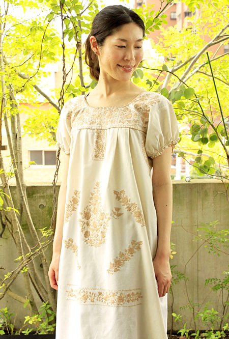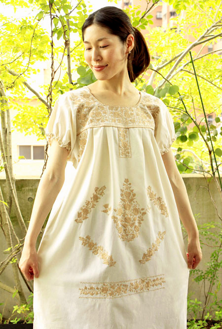 メキシコ刺繍オリジナルワンピース [マンタ生地-ベージュpajaritos]