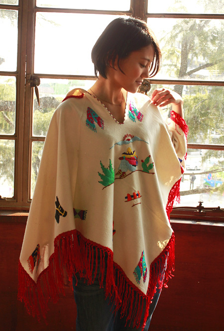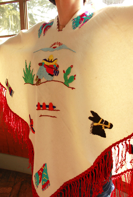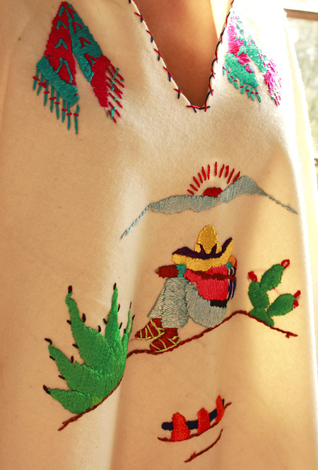 ウールの生地に手刺繍で馬やメキシコ人、サボテンなどの刺繍が。