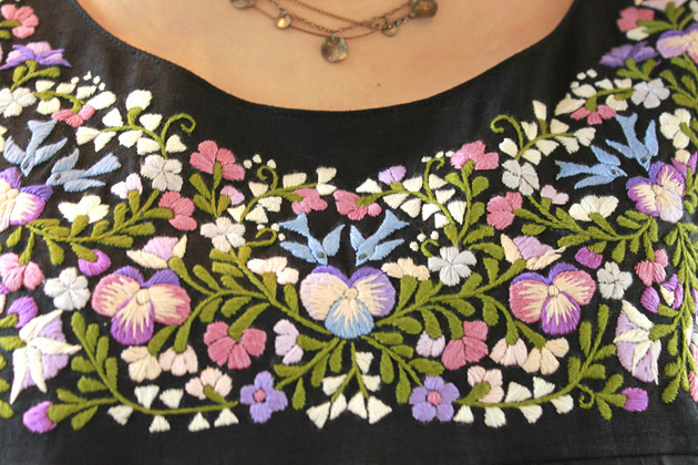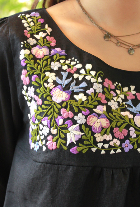 洋服デザインの手刺繍ワンピース [7分袖リネン生地ブラック]