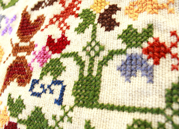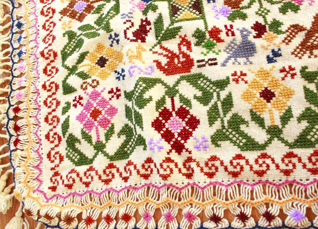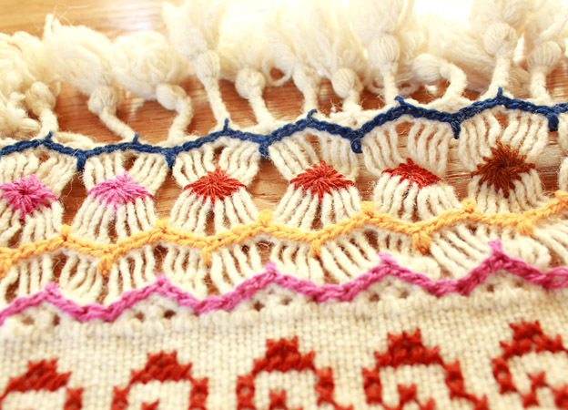 出来上がった布に手刺繍を入れて、フリンジを編み仕上げます。
