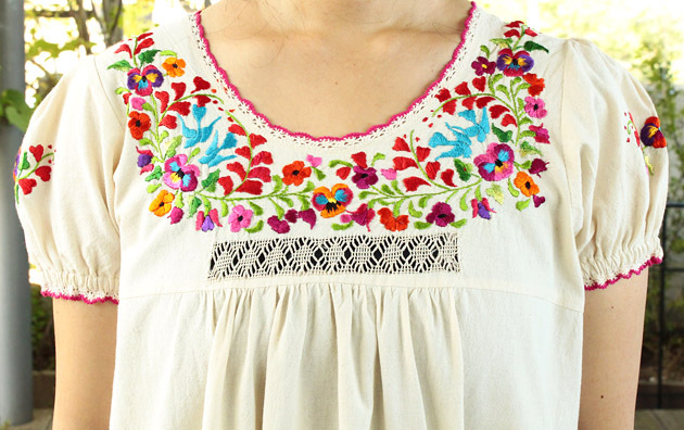 洋服の縫製技術の発達していないメキシコの刺繍製品は、直線のカットで無理に立体に仕上げていたりと、着用すると、脇の布がだぶついたり、胸にしわやヒキツリが出る場合などがあります。