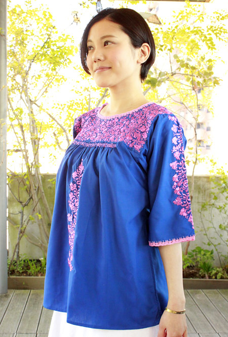 刺繍は、光沢あるレーヨン糸で、濃いサックスブルーにメキシカンピンクの刺繍が鮮やかです。