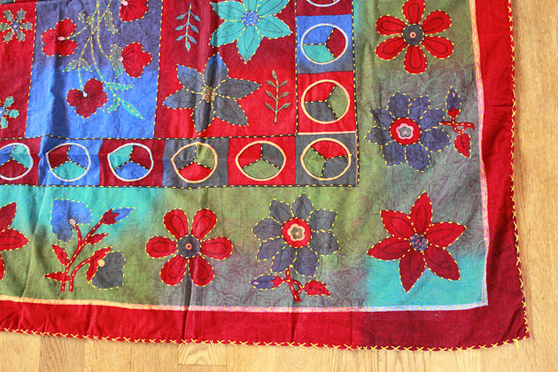 インド綿ブロックプリントと刺し子刺繍のマルチカバー [レッド花]