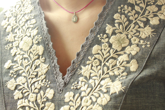リャマリャマオリジナルのメキシコ刺繍図案で、Vネックベルスリーブのトップスを仕立てました。