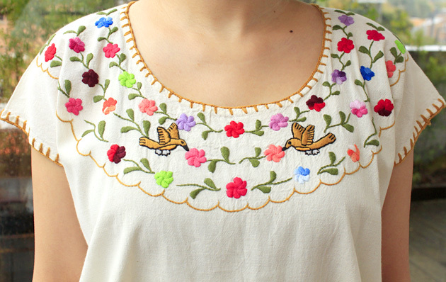 メキシコ、オアハカ州で作られた小鳥と小花の刺繍ブラウス。