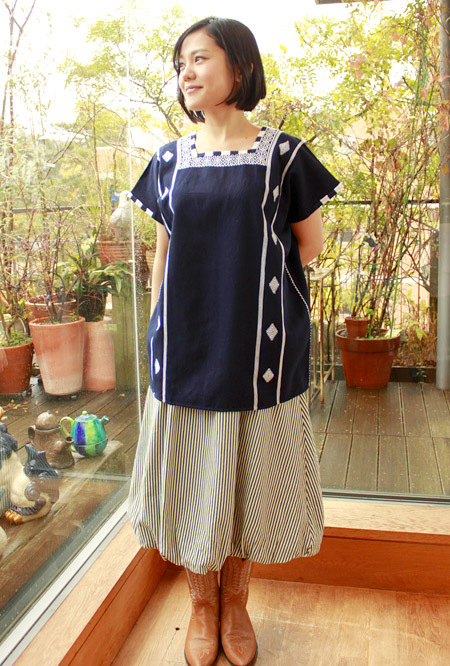 手織り生地のウィピルトップス [ララインサール-紺×白]