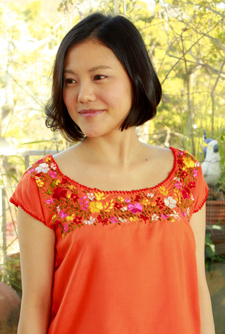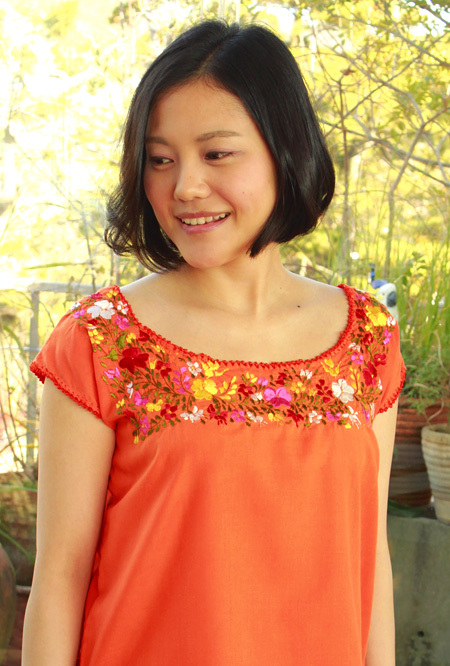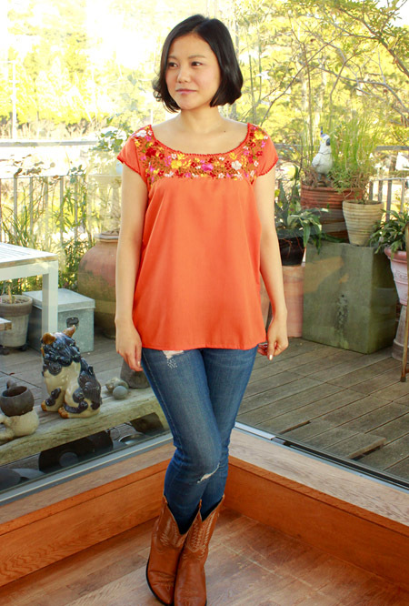 オレンジ色の生地に、カラフル刺繍が元気なイメージ。