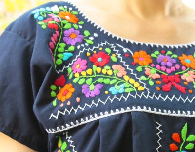 メキシコ、プエブラ州の花の刺繍ワンピース。