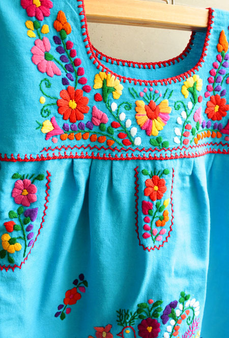 メキシコ刺繍のワンピース [120サイズターコイズマンタ]