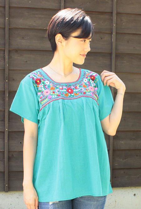 ガーゼ生地のメキシカントップスM〜LLサイズ [San Gabriel Chilacエメラルド]