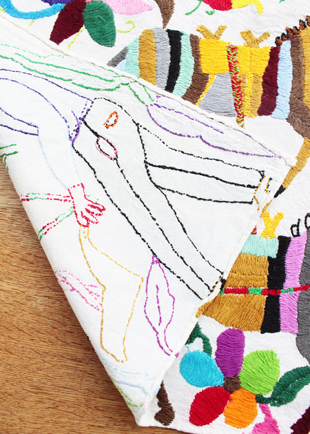 とても細かく緻密なオトミのステッチで描かれるその刺繍技術はすばらしく、隙間なくきれいに施されます。