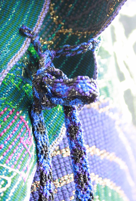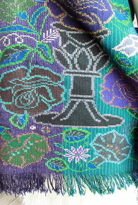 生地は腰折りの技法で手縫いされ、その生地の目に細かなクロスステッチで刺繍が施されています。
