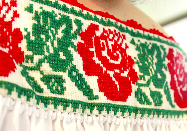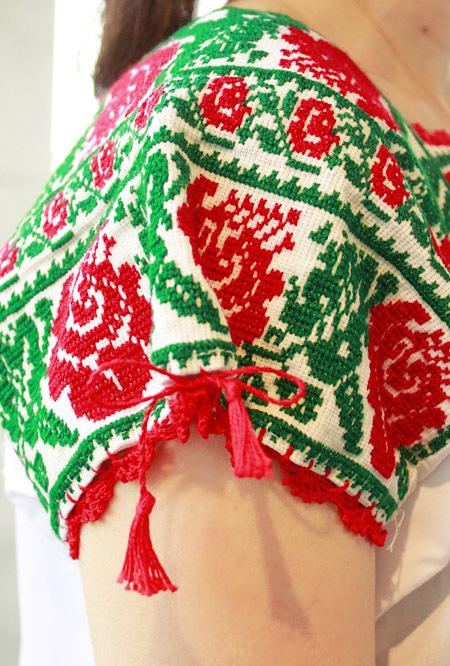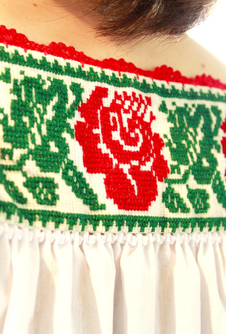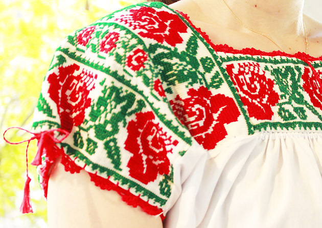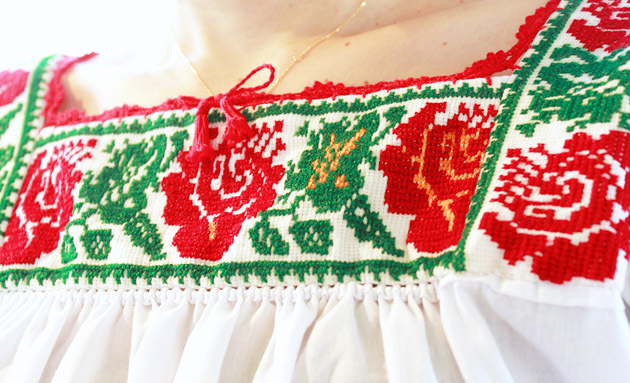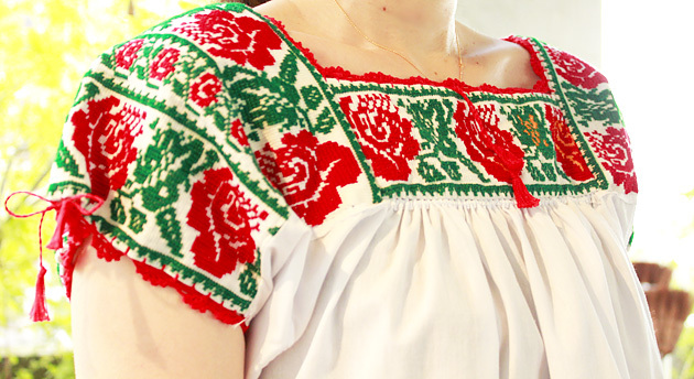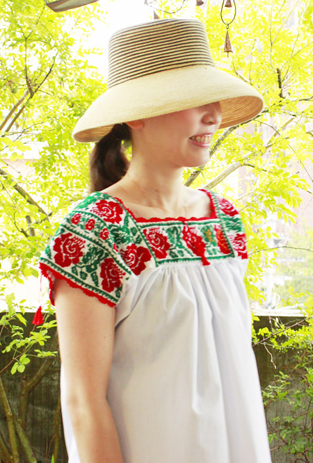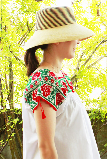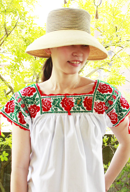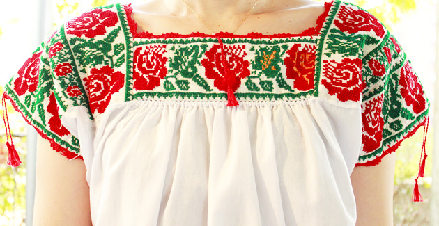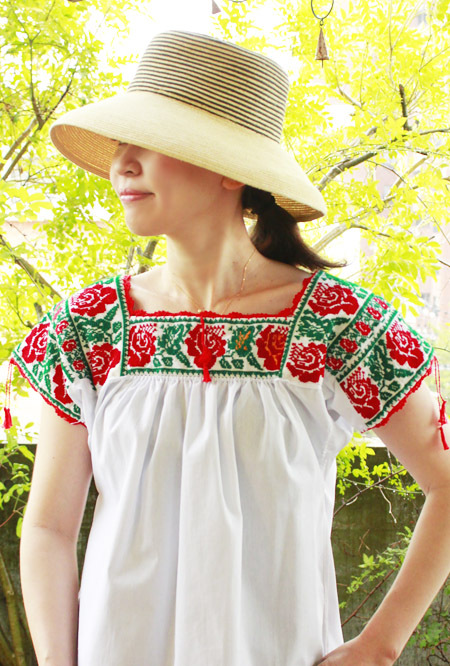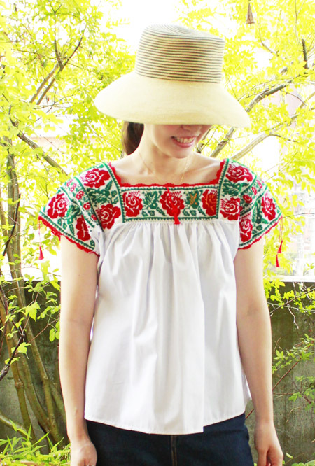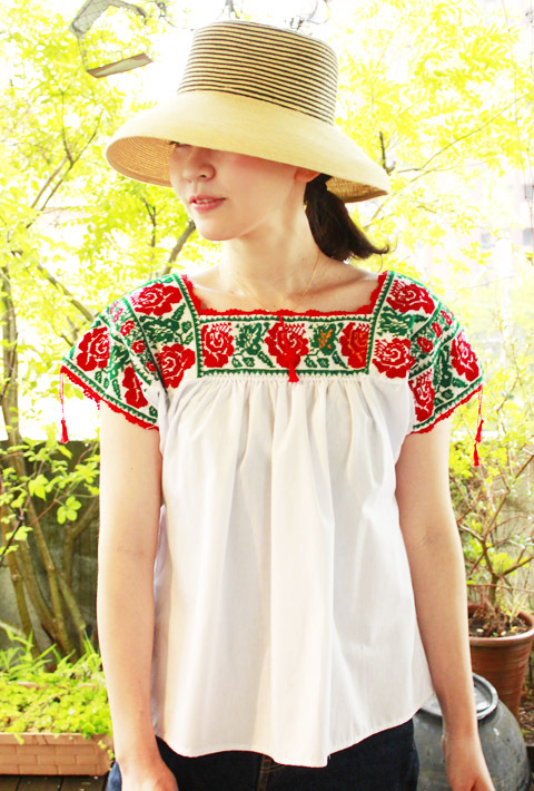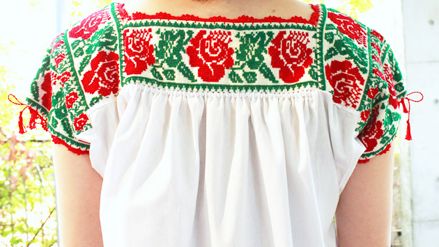 綺麗に刺繍された白地に赤の薔薇はいかにもメキシコらしい1着。