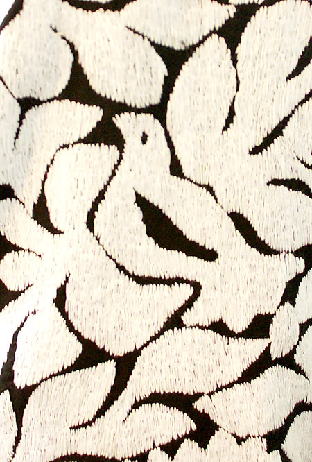 真っ直ぐなフォルムと、大ぶりの鳥や植物の刺繍が斬新なデザイン。