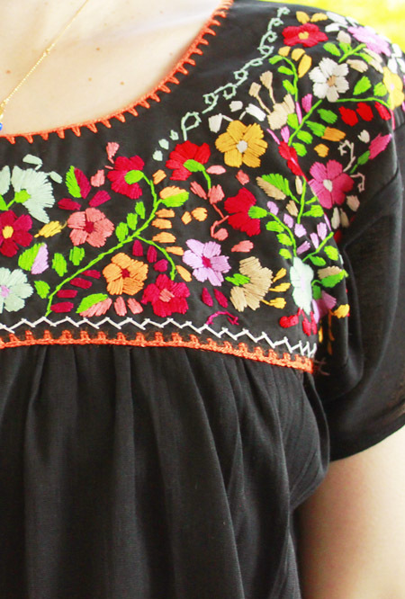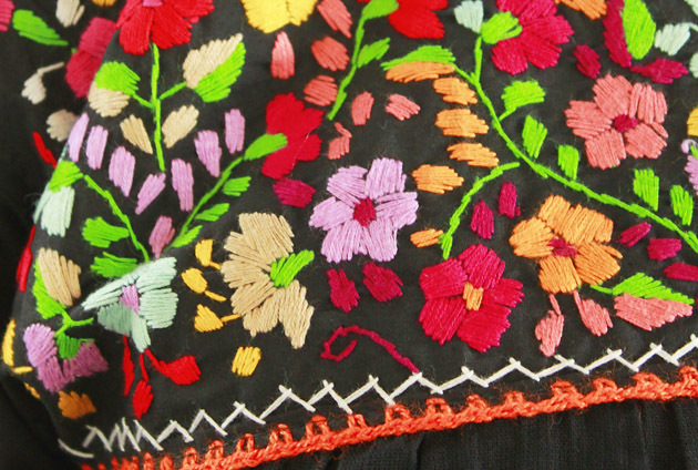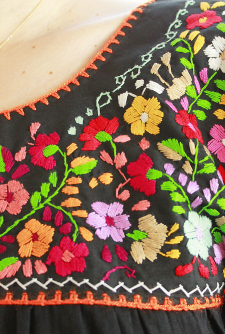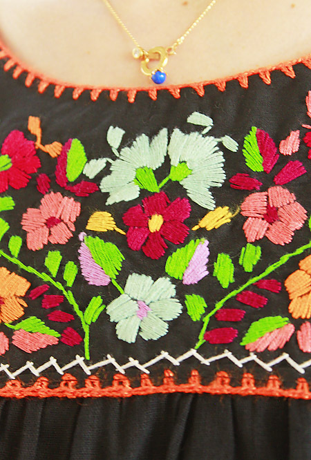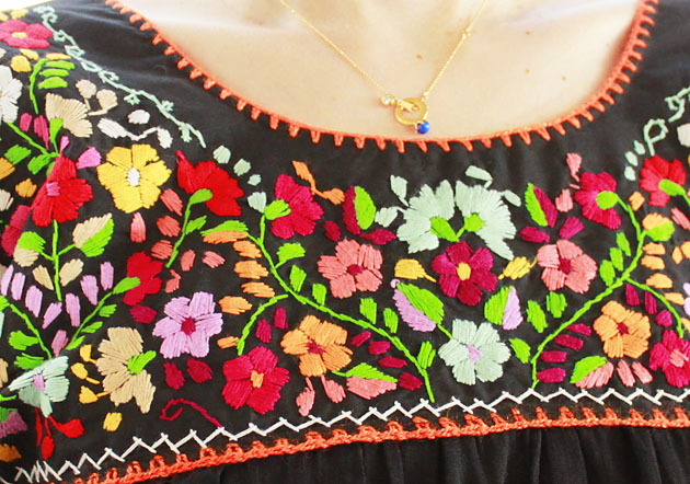 メキシコ製の綿ガーゼ生地を使用し、カラフルな小花はすべて手刺繍で刺されています。