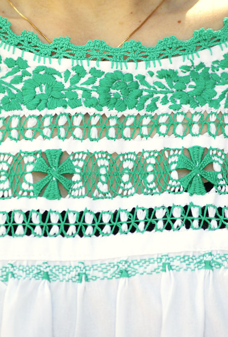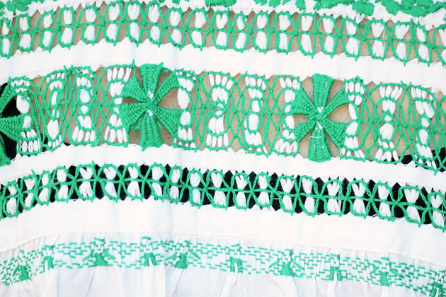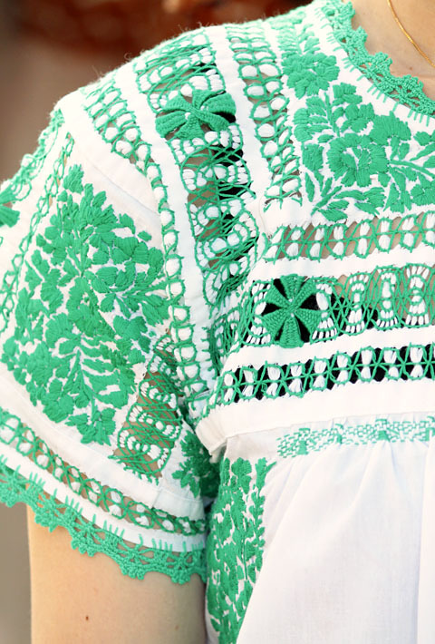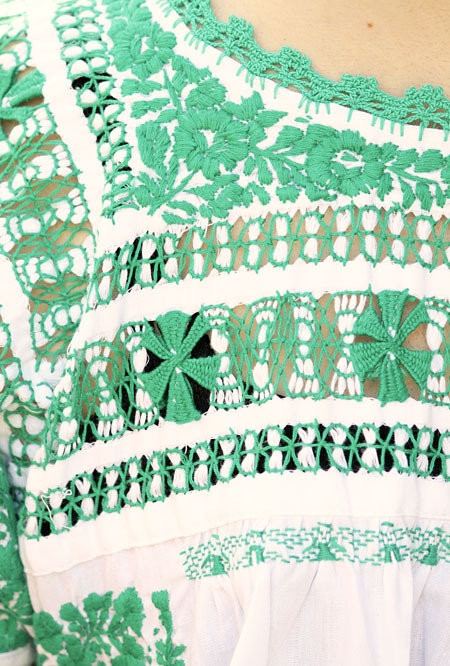デスイラード 英語ではドロンワークと呼ばれるこの手法は、レースを縫いつけるのではなく、 生地の横糸を抜き、刺繍によって縦糸を結びながら模様を描いていくという、 とても難しく根気のいる作業で作られます。 手間と高い技術が必要とされるため、このデスイラードが入っている洋服は特に高級とされています。