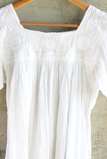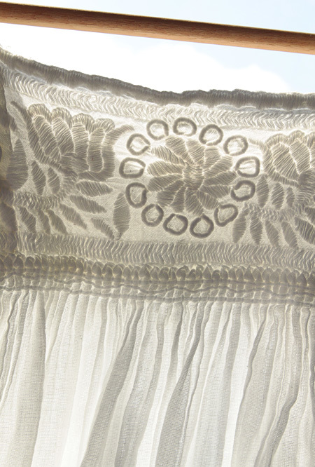 メキシコ製の風合いある綿生地マンタ生地の薄手ガーゼ生地に刺繍された1着です。
