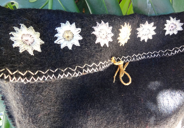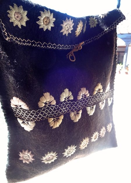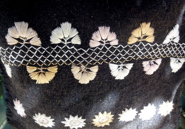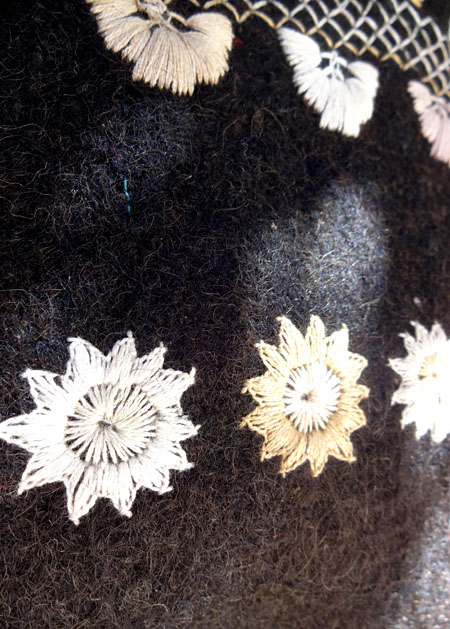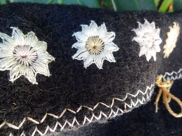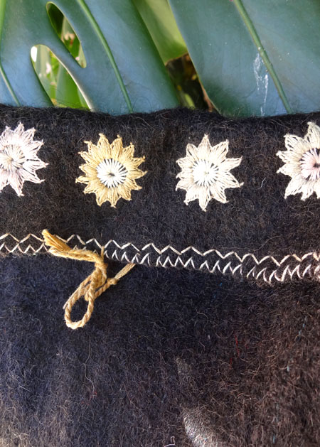 羊毛から手で糸を紡ぎ、手織りした生地に、毛糸で刺繍を刺しながら、手縫いで形を仕上げます。