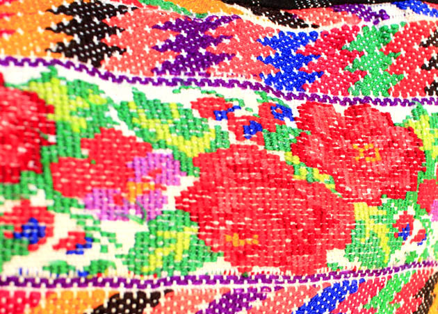 複雑な模様が描かれた手織り生地の上に刺繍糸で花や幾何学模様が施された贅沢なウィピルを使用。