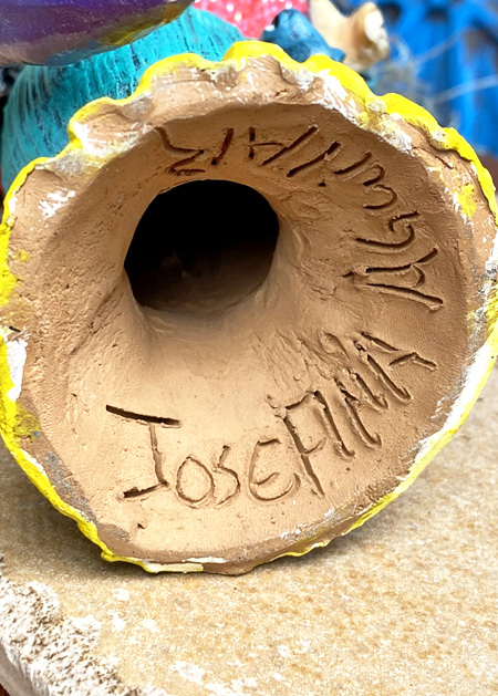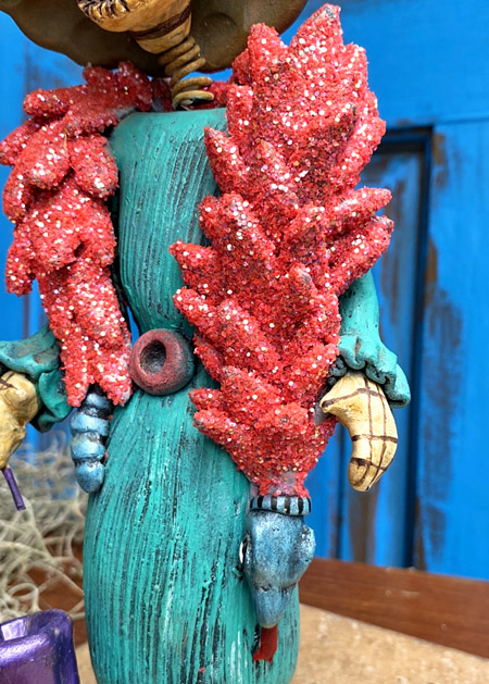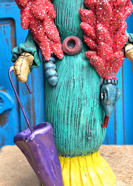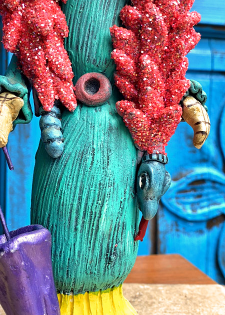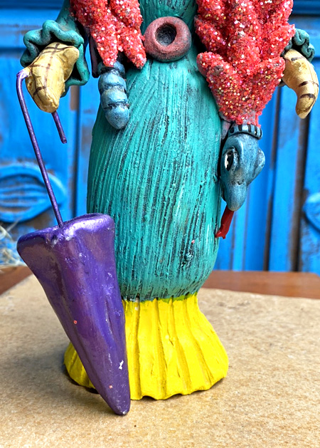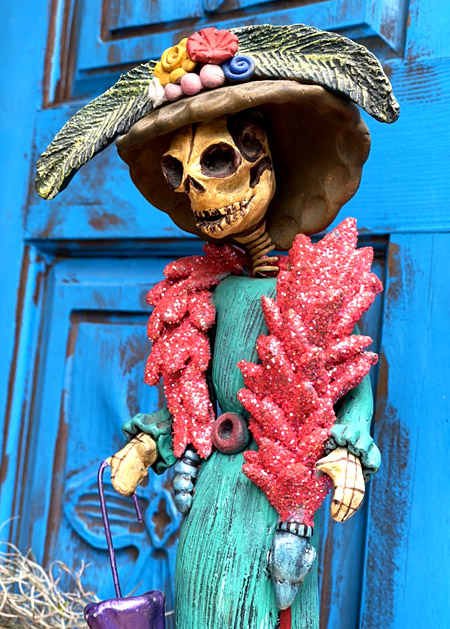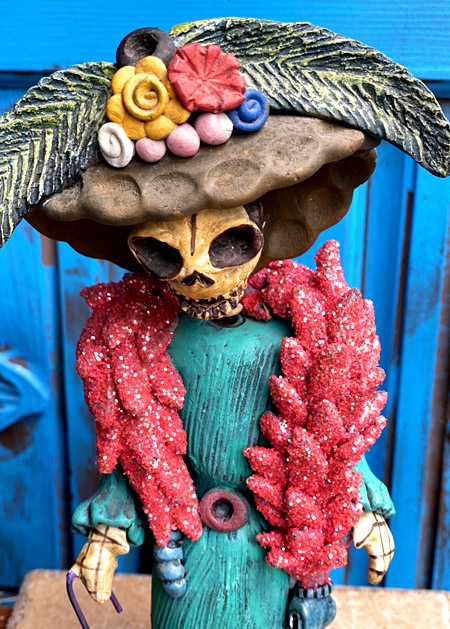 西洋貴婦人のように着飾った、ガイコツレディのカトリーナの素焼き陶器人形です。