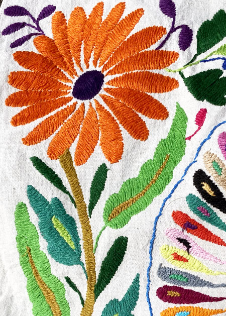 メキシコ製の風合いある綿生地、マンタ生地に刺繍されています。