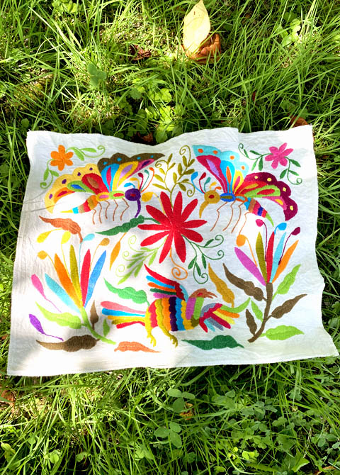 メキシコ製の風合いある綿生地、マンタ生地に刺繍されています。