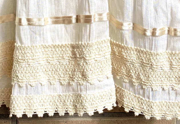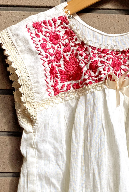 ガーゼ生地にレースやリボンを重ね、刺繍部分はマンタ生地と呼ばれるメキシコのコットン生地を使用