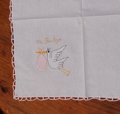 「私の洗礼式」と書かれたこのハンカチ。記念品として配るために作られたり、赤ちゃんの思い出に取っておくために