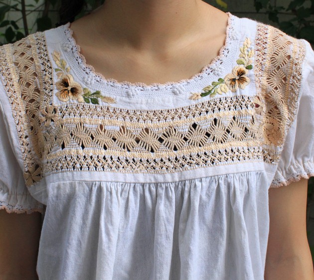 | 特に特徴的なのはデスイラードと呼ばれる手法で、レースになっている部分です。 これは生地の横糸を抜き、刺繍によって縦糸を結びながら模様を描いていくとても難しく、根気のいる作業です。 このデスイラードが入っている洋服は特に高級とされています。 |